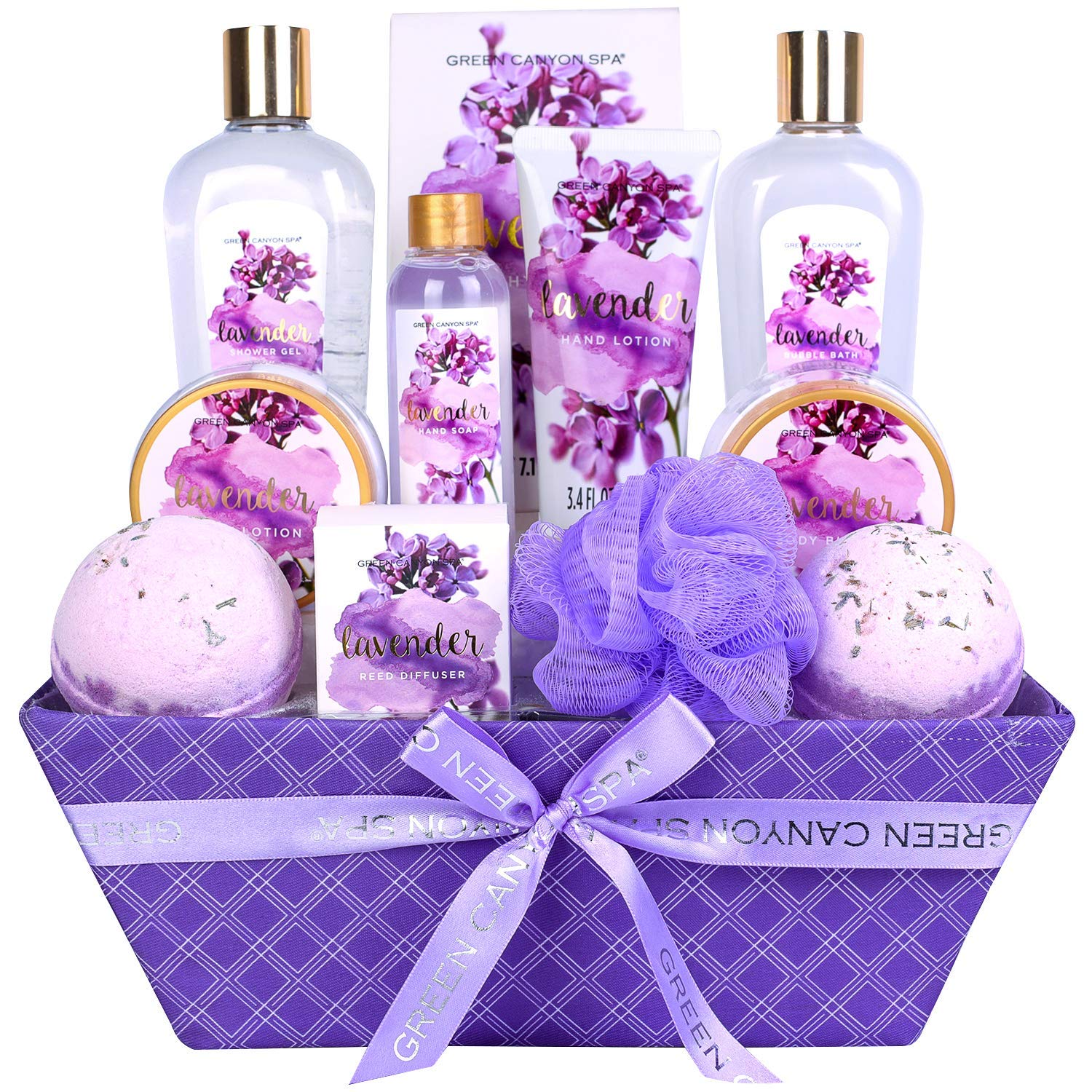 Amazon Com Green Canyon Spa Lavender Spa Gift Baskets For Women Luxury 12 Pcs Birthday Bath Gift Sets Includes Bubble Bath Large Bath Bomb Reed Diffuser Beauty