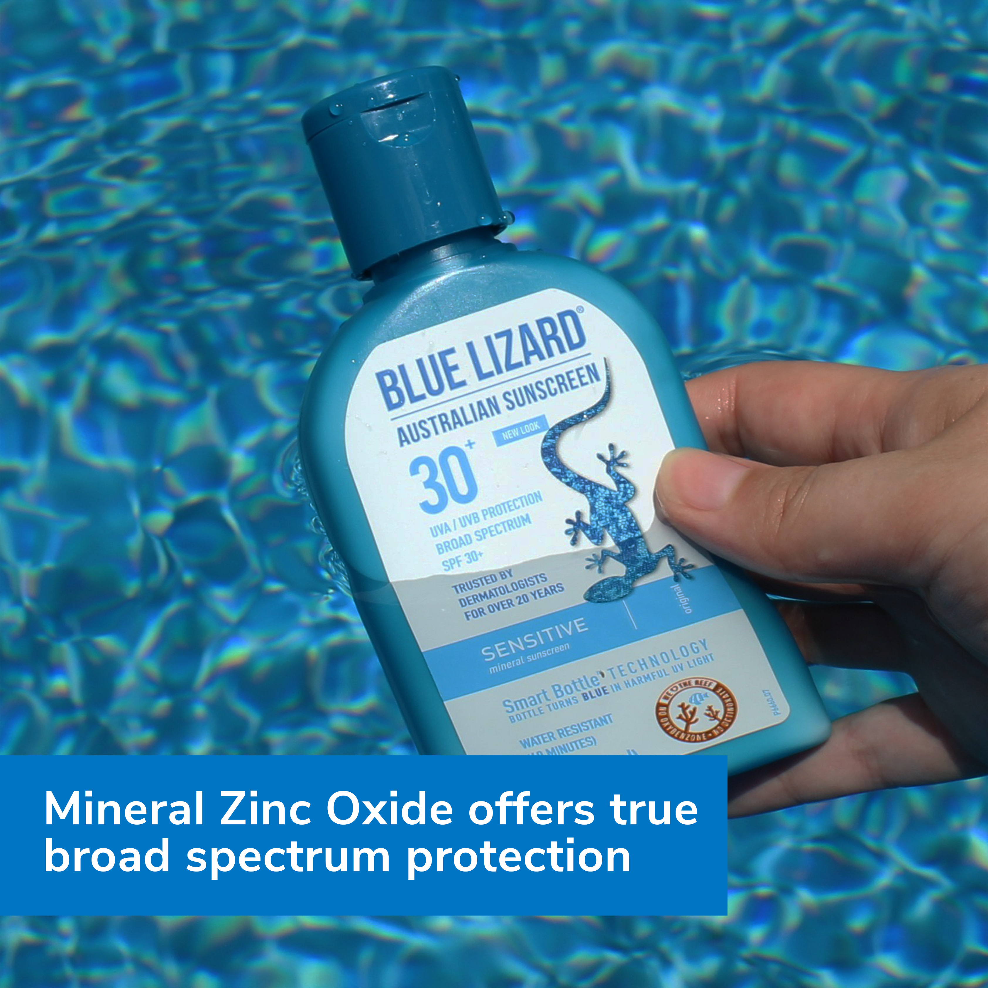 Blue Lizard Australian Sunscreens mineral Sensitive Face sunscreen is designed for daily wear. Smart Bottle and Smart Cap Technology Every bottle and tube cap changes color in harmful UV light. WE LOVE THE REEF To help protect delicate coral reefs our Sensitive sunscreen contains no Oxybenzone or Octinoxate.