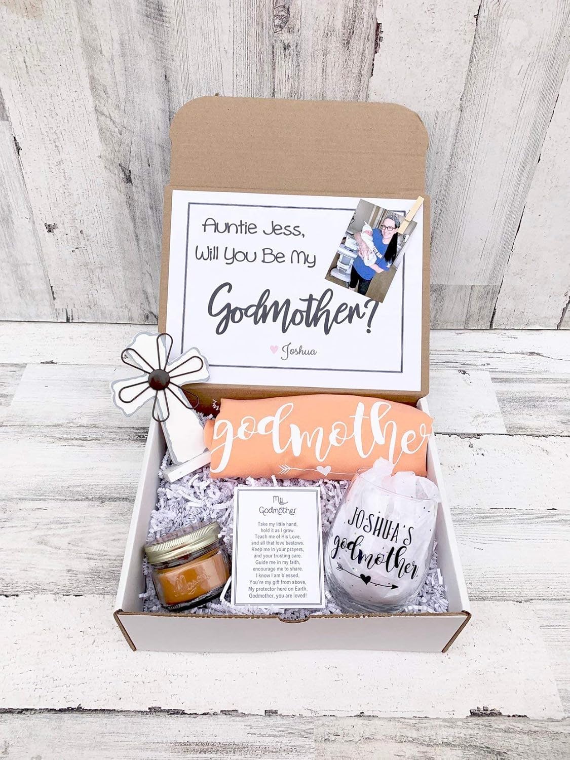 Godmother Box - Personalized Godmother Gift - Will you be My Godmother Box 4320 5400. The most personal godmother gift with a photo and or name. Premium matte white box Magnetic closure Fits a 200mL champagne flute Box size.
